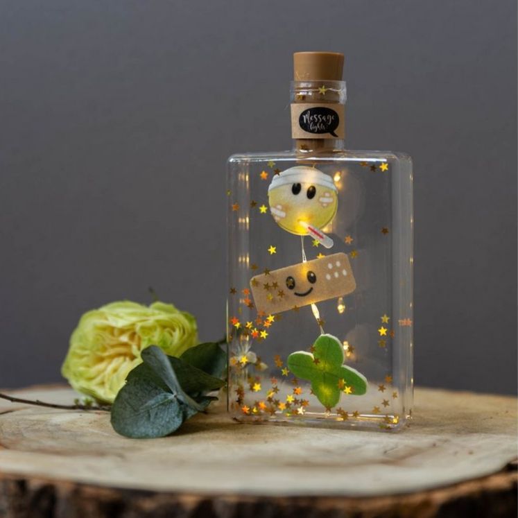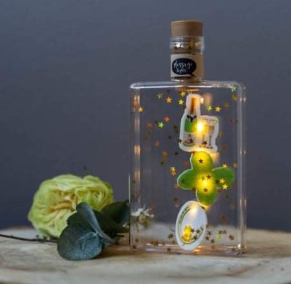 Kunststof flesje met lichtjes. Met adresdoosje om op te sturen.